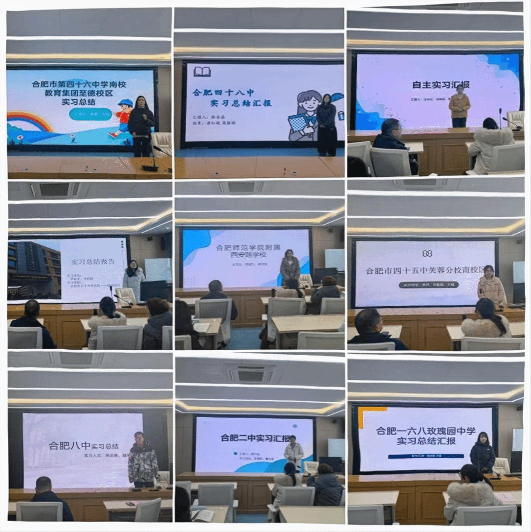 会议围绕2025年下半年为期四个月的教育实习工作展开,总结实践成效,交流实习体验,并就进一步优化研究生实习工作听取学生和教师意见建议。会上,学生代表结合各自实习经历,从实习内容、专业实践收获以及现实困惑与改进建议等方面进行了交流汇报,现场讨论充分、气氛热烈。来自合肥八中、合肥二中、合肥168玫瑰园学校、合肥48中、合肥45中芙蓉分校、合肥46中南校教育集团至德校区、永利集团yl6809附属西安路学校、合肥50中天鹅湖教育集团、合肥50中东校等实习基地的研究生代表依次发言。同时,来自安徽省潜山第二中学、河南省商丘市昌华中学、安徽省淮南市第三中学、江苏省徐州市经开区实验中学的4名自主实习研究生也作为代表进行了交流分享。