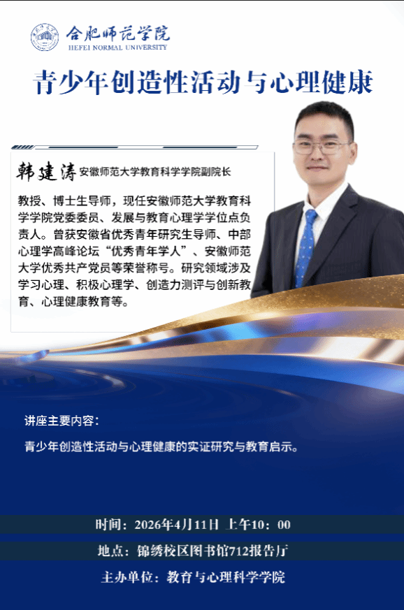 报告人简介:韩建涛,教授、博士生导师,现任安徽师范大学教育科学学院党委委员、副院长、发展与教育心理学学位点负责人。曾获安徽省优秀青年研究生导师、中部心理学高峰论坛“优秀青年学人”、安徽师范大学优秀共产党员等荣誉称号。研究领域涉及学习心理、积极心理学、创造力测评与创新教育、心理健康教育等。