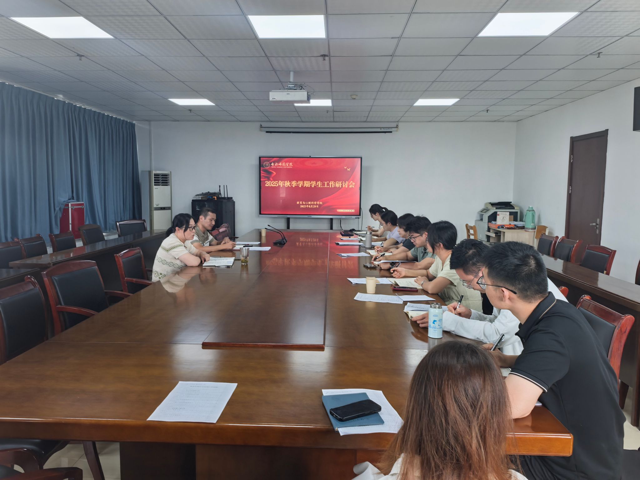 陈帅首先总结回顾了上学期学生工作,充分肯定了全体专兼职辅导员付出的辛勤努力。对新学期工作,他部署了两方面任务,一是抓实日常管理,确保安全稳定。要精准掌握学生动态,严格学生事务管理,筑牢筑紧安全防线,做实做细迎新工作等。二是抓紧重点工作,突出特色成效。要持续强化学风建设,鼓励引导学生备赛备考,夯实专业基础;要用好用足学生社区,制定管理规定与活动清单,打造集思想教育、专业互动、心理育人、文化生活于一体的综合育人平台;要关注学生心理健康,持续完善三级预警体系,通过讲座、团辅等引导学生健康生活;要提升就业指导服务,突出“早引导、拓资源、精帮扶”三大举措,提高考研和就业成效;要深化特色活动,举办第二届行知文化节,优化升级六大类31项活动,持续深化《教院青年说党史》和《“1+4”主题党日活动》,推动实践成果向理论课题转化,筹备《青春之歌》和《“追光者”日记》2项创新活动,为学校70华诞献礼;要加强队伍建设,定期邀请省级优秀辅导员开展案例交流,提升辅导员科研与管理实操能力。